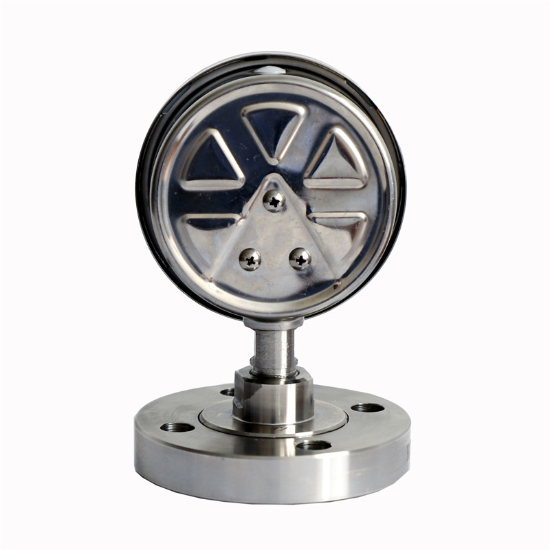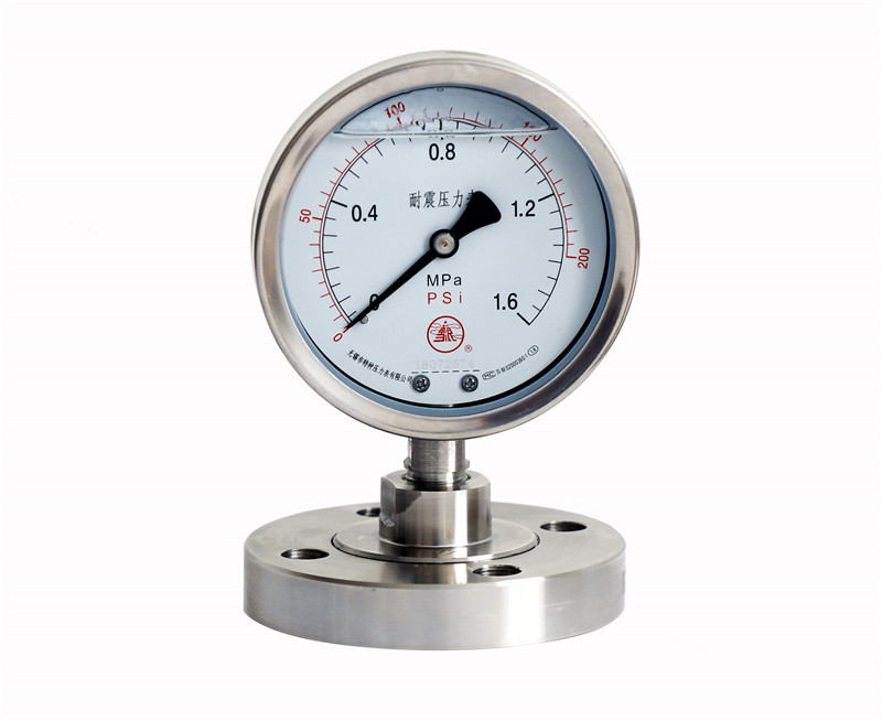 法蘭式隔膜壓力表采用間接測量結(jié)構(gòu),用隔離膜片將被測介質(zhì)與敏感元件隔開,與設(shè)備采用法蘭連接,適用于測量強腐蝕、高溫、高粘度、易結(jié)晶、易凝固、有固體浮游物的介質(zhì)壓力以及必須避免測量介質(zhì)直接進(jìn)入通用型壓力儀表和防止沉淀物積聚且要易清洗的場合。隔離器有多種材料,以適應(yīng)各種不同腐蝕性介質(zhì)。儀表適用于化學(xué)工業(yè)、化纖、合成纖維、石油、染化、制堿等工業(yè),并有各種材質(zhì)的隔離膜片及各種公稱通徑法蘭接口形式以供不同的工礦條件選用。本公司可根據(jù)用戶需要,設(shè)計、制造特殊用途的法蘭式隔膜壓力表產(chǎn)品,歡迎來人來電、來函洽談!